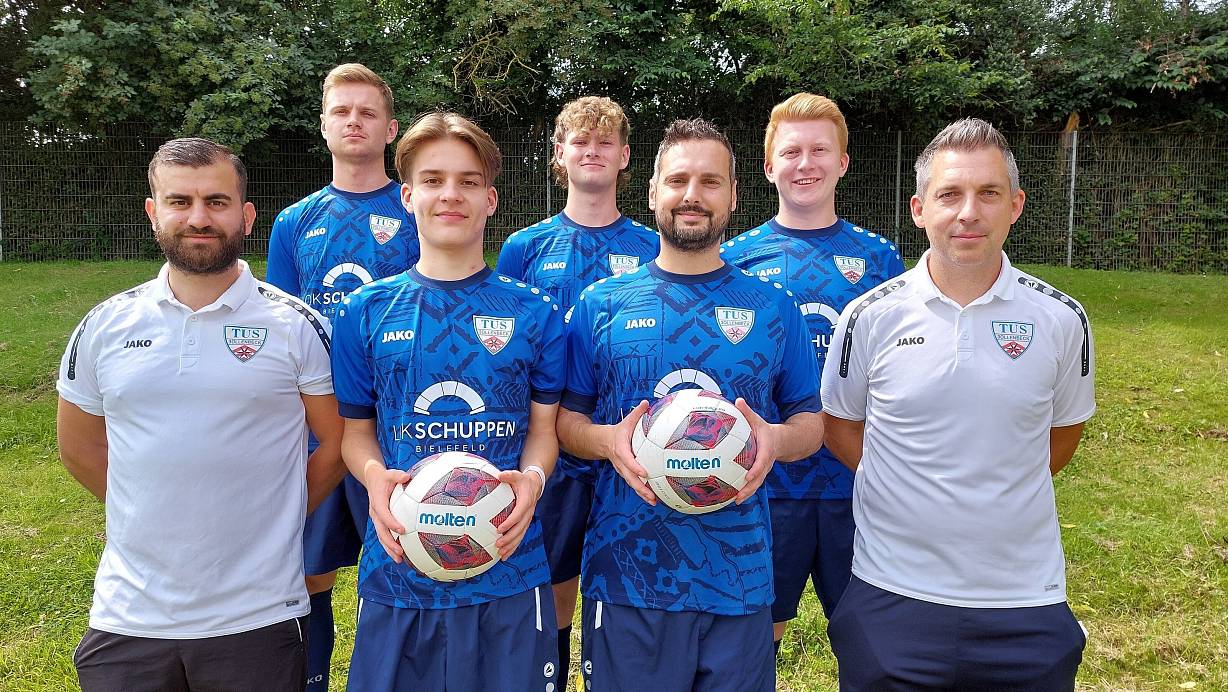 Jöllenbecks Co-Trainer Rano Sabir (v. l.) mit den Zugängen Marcin Tyburcy, Linus Steinsiek, Benno Vahle, Hakan Kocaman, Kevin Cieslik und Sport-Leiter Tobias Demmer. | © Nicole Bentrup