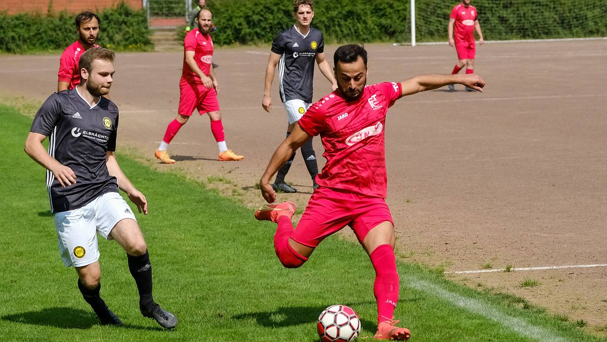 Türk Sports Mert Bozkurt nutzt gegen den VfR Wellensiek eines der zwei begrünten Drittel des heimischen „Glatzenplatzes“ am Kupferhammer, um seine Flanke in den aschenen Strafraum zu schlagen. Der FC siegt 3:0. | © Andreas Zobe