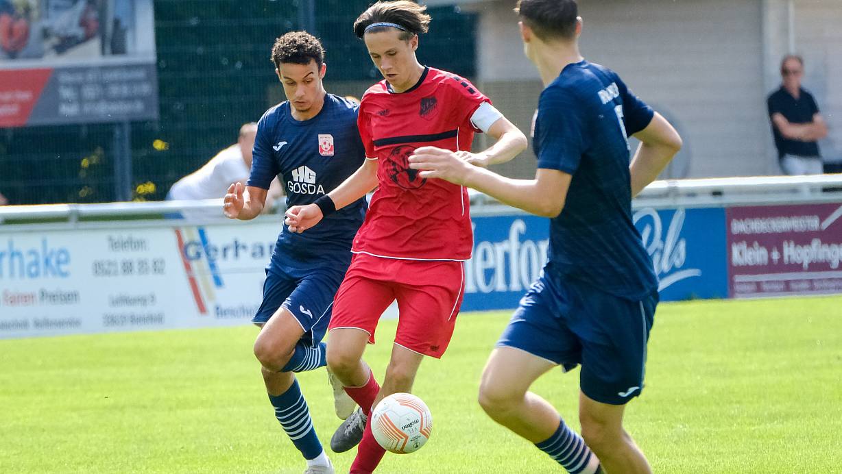 U19-Kapitän Elias Morgenroth (Mitte) und der VfL Theesen mussten im ersten Saisonspiel gegen RW Ahlen ein 1:5 hinnehmen. | © Andreas Zobe