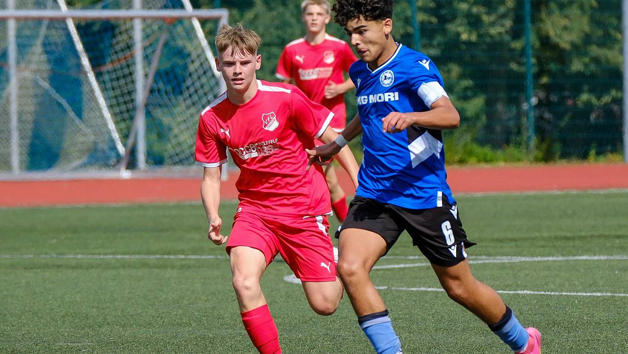Arminias B-II-Jugend mit Eyyüb Yasar (r.) hatte gegen Mika Wagners Theesener das bessere Ende für sich und erzielte in der dritten Minute der Nachspielzeit das 2:1. | © Andreas Zobe