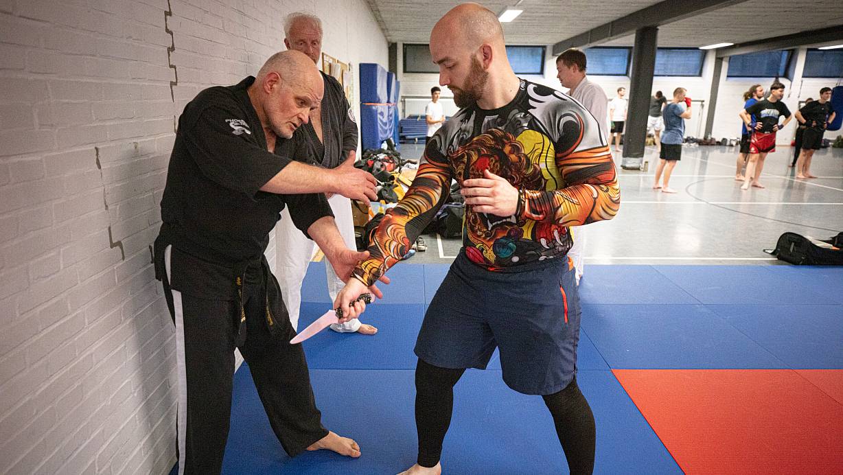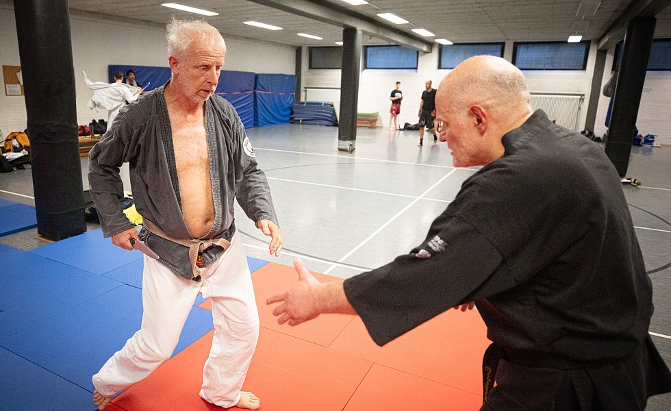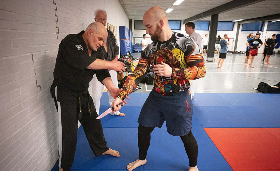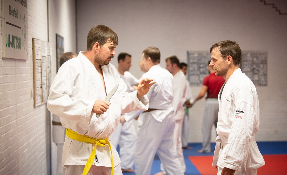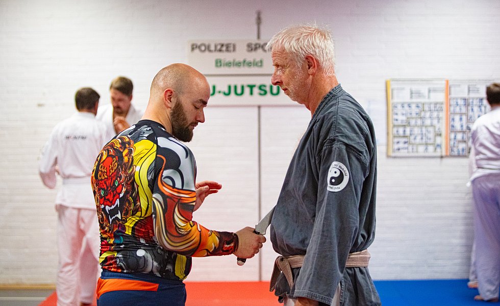 Bielefeld. Das Thema Selbstverteidigung wird in Kampfsportkreisen heiß diskutiert. Speziell, wenn es um Waffen geht. Oft werden komplizierte Techniken als realistische Selbstverteidigung verkauft. Ju-Jutsu Trainer Engelbert Wallek vom PSV Bielefeld (68, 5. Dan/Schwarzgurt) hält nichts von unnötigem Schnickschnack. Die Selbstverteidigungstechniken, die er zeigt, sind schnell, hart und präzise. Beim Thema Messerabwehr setzt er nicht auf realitätsferne Entwaffnungstechniken. Seine Devise: Schnellstmöglich eine Fluchtmöglichkeit schaffen.