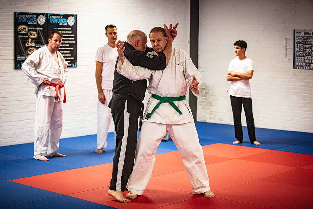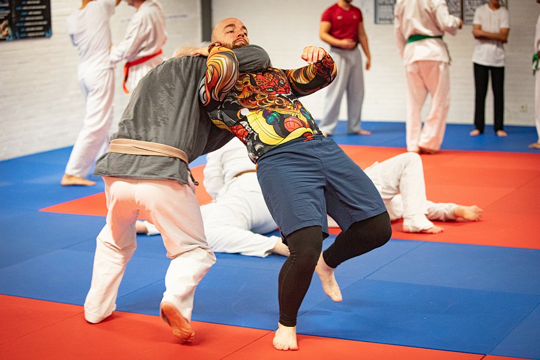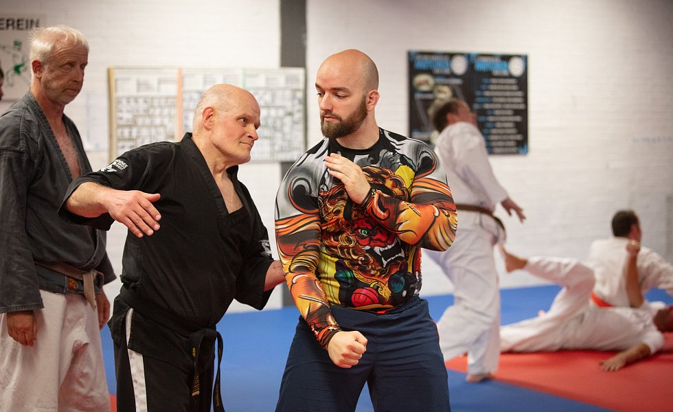 Wallek stimmt zu, dass man, je nach Gegner, unterschiedlich agieren müsse. Gegen einen guten Boxer sieht er bessere Chancen im Griff- und Bodenkampf. Hier zeigt sich wieder: Ju-Jutsu ist vielseitig. „Dein Ju-Jutsu ist wahrscheinlich ganz anders als meins“, sagt Wallek zu Ralf Elbrächter (1. Kyu/Braungurt). Der Trainer geht davon aus, dass sich die Sportler spezialisieren und herausfinden, was für sie selbst am besten funktioniert. Elbrächter stimmt zu: „Man kann sich rauspicken, was man will: Jeder ist anders, einer ist mit den Armen schneller, der nächste hat Stärken in anderen Bereichen.“