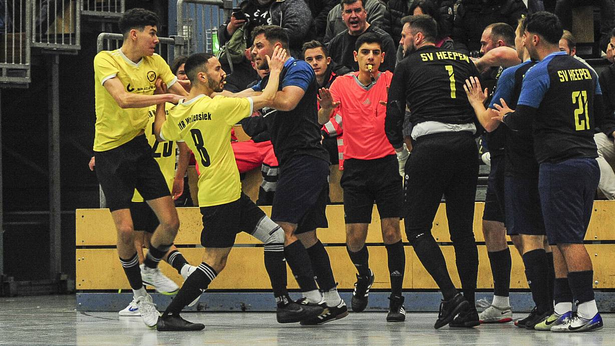 Wellensieks Yasin Allouch (2. v. l., Nr 8), mischte auch bei einer Rangelei im Spiel gegen Heepen mit. Sonst konzentriert sich aufs Kicken. | © Jörg Dieckmann