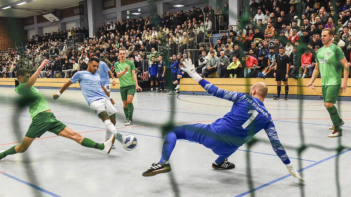 Vor voll besetzten Rängen erzielt Paulo Garibaldi das zwischenzeitliche 3:0 für den MCH Futsal Club gegen den TuS Dornberg. TuS-Keeper Joschka Leier fliegt vergebens. | © Jörg Dieckmann - www. dieckmann-fotodesign.de
