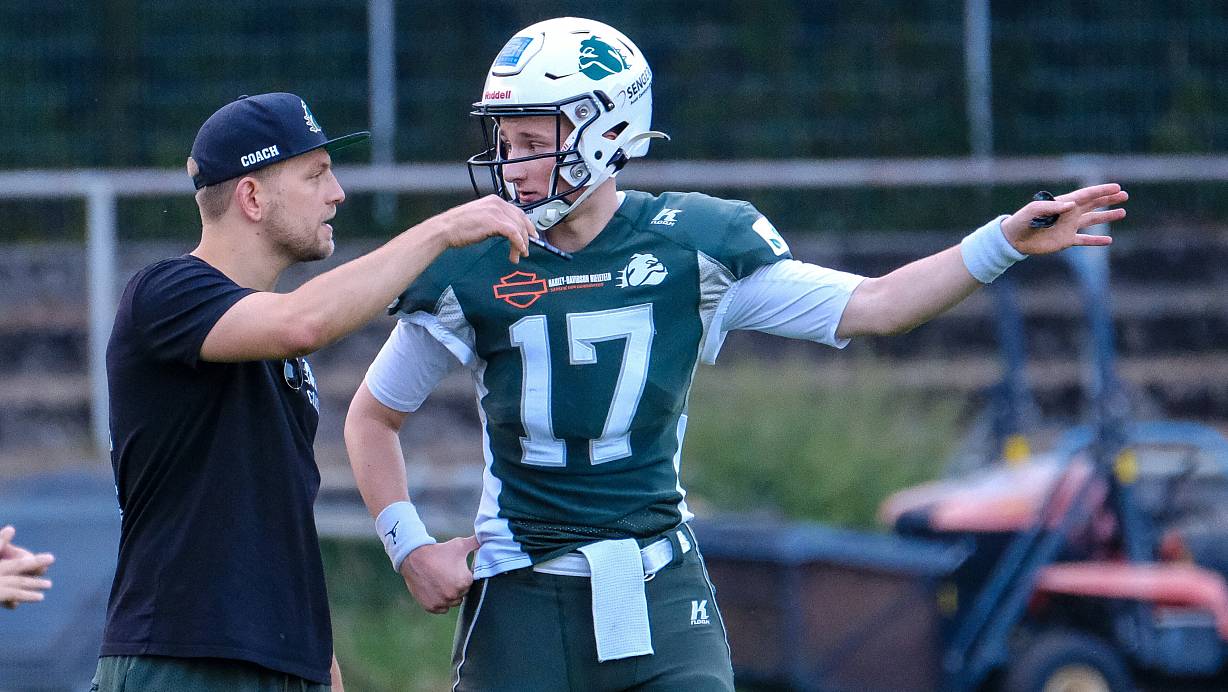 Da gehts lang: Trainer Felix Gorny im Gespräch mit Quarterback Luis Altehoefer. | © Andreas Zobe