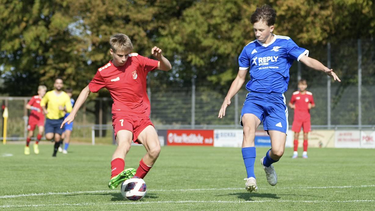 Theesens Silas Bode (l.) traf für den VfL Theesen im Spiel der C-Jugend-Westfalenliga in Wiedenbrück. | © Peter Unger