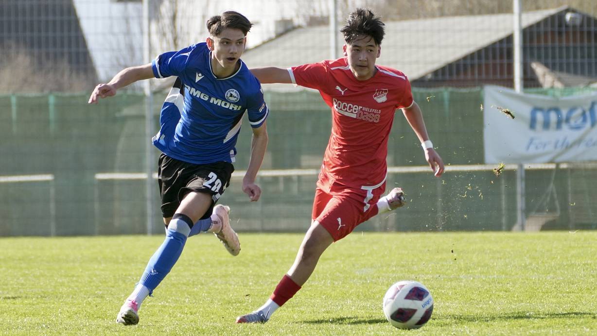 Synchronfußball: Arminias Onur Yazman (l.) und Theesens Omid Atayi trennten sich im B-Junioren-Derby 1:1. | © Peter Unger