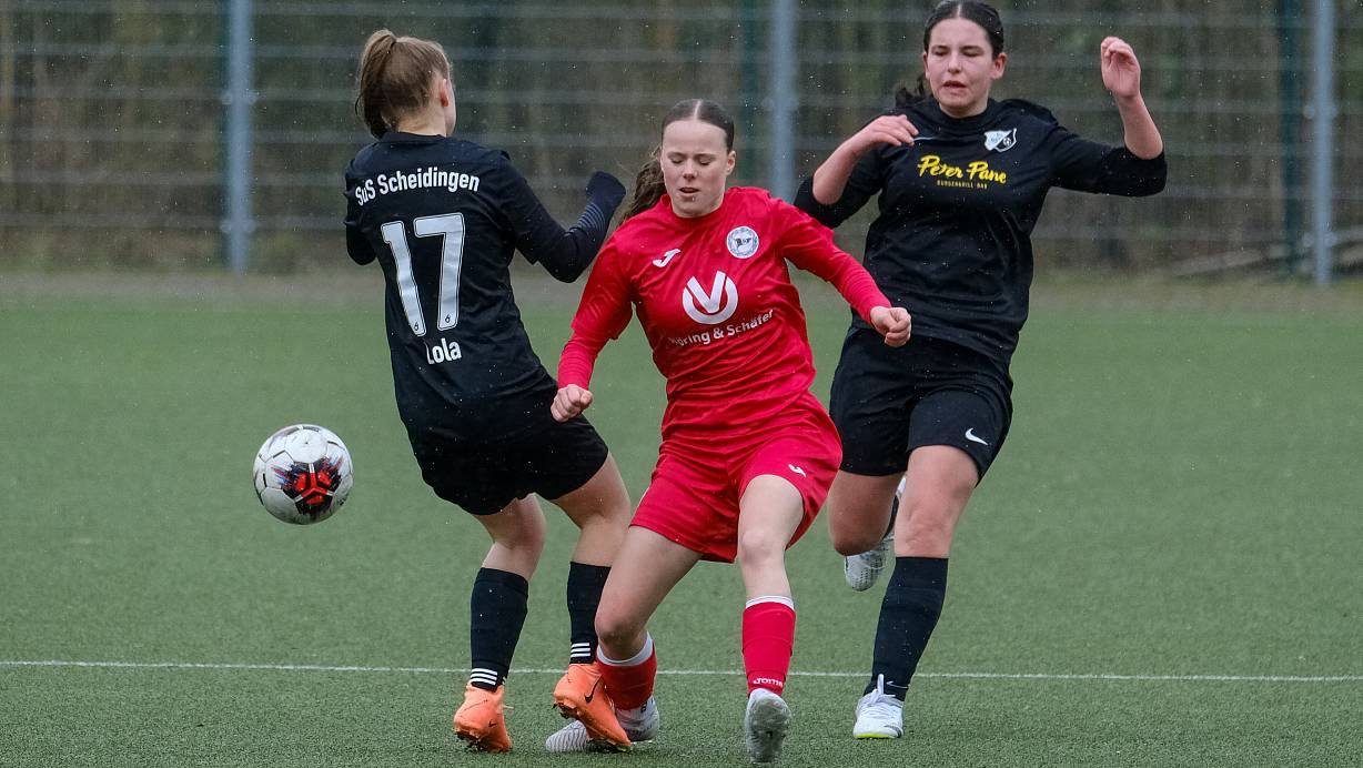 Ryke Tela Berkowitz (Mitte) von Arminias Westfalenliga-B-Juniorinnen hat es in dieser Szene gleich mit zwei Gegenspielerinnen zu tun. | © Andreas Zobe