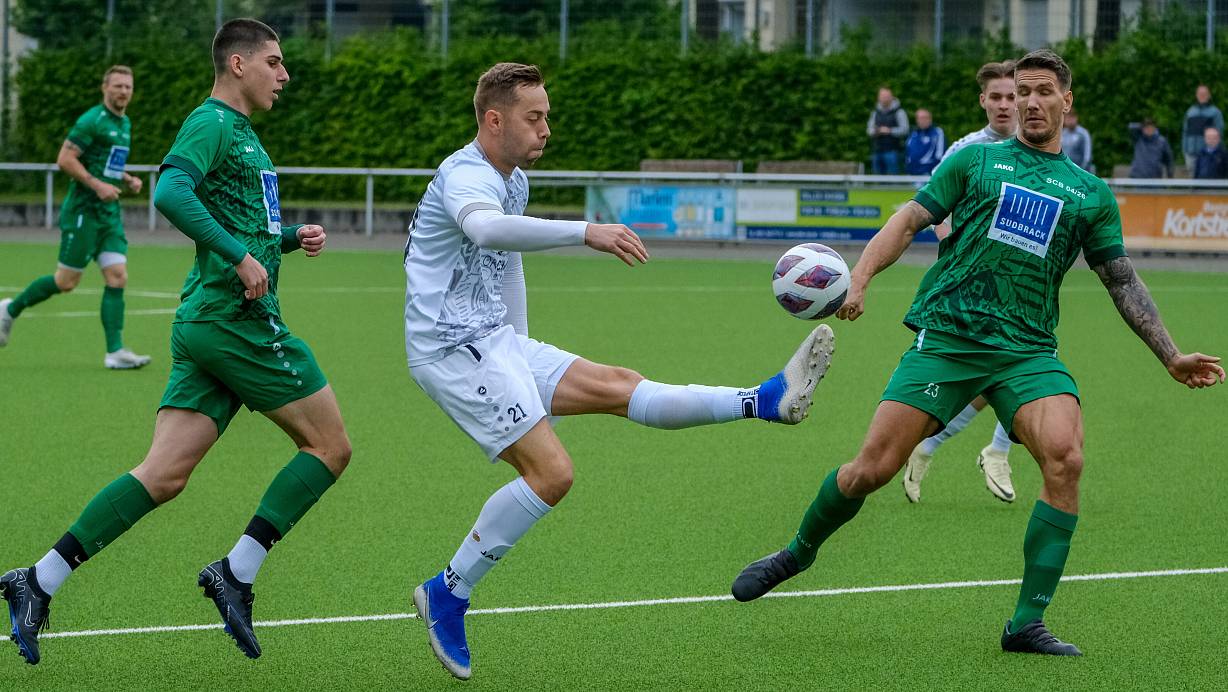 Jöllenbecks Ole Schürmann (Mitte) erzielte das 3:0 für seinen TuS im Derby beim SCB. | © Andreas Zobe