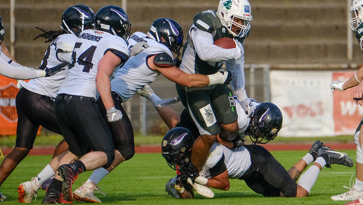 Alle Mann auf Jalen Starks: Der Bielefelder Runningback hat hier gleich fünf Langenfelder buchstäblich an den Hacken. | © Andreas Zobe