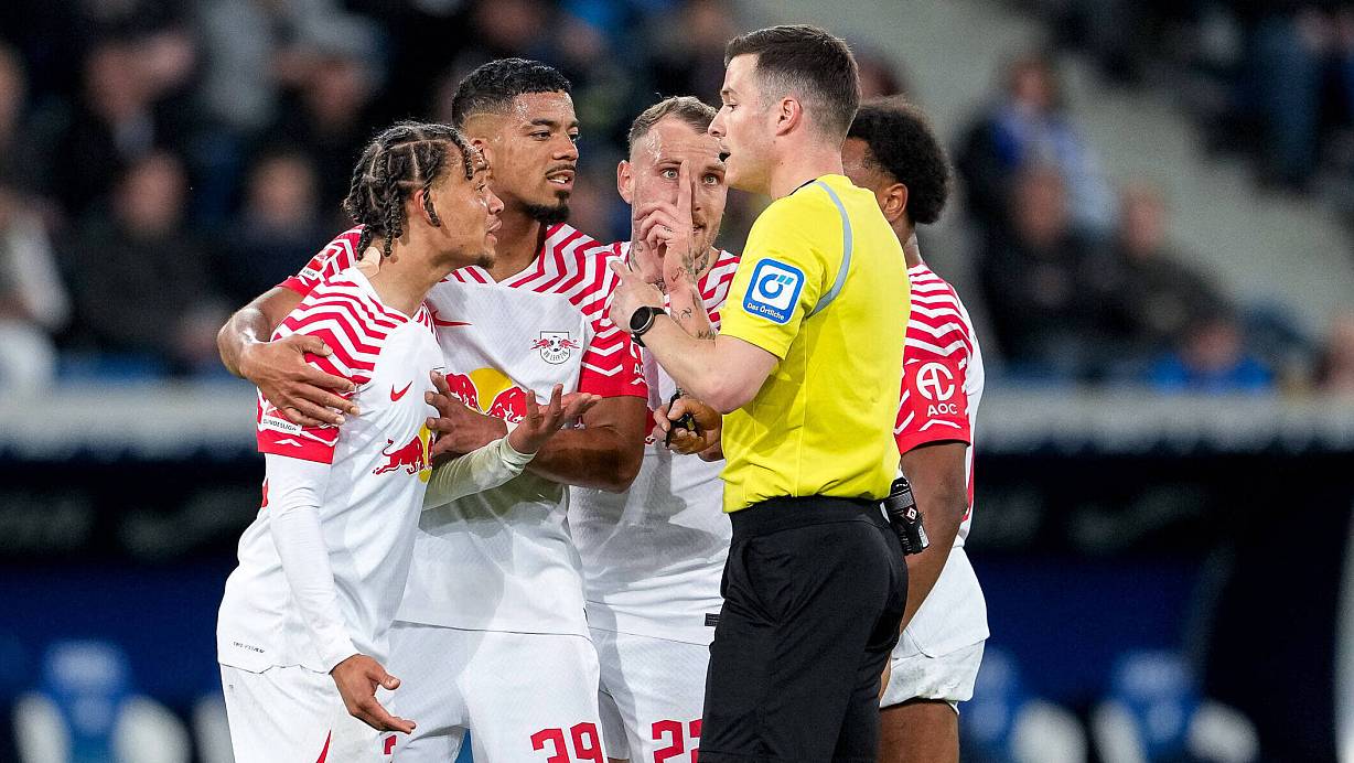 Beschweren und lamentieren: Bundesliga-Schiedsrichter Harm Osmers wird hier nach einer Entscheidung von Leipziger Spielern bedrängt. | © IMAGO/foto2press