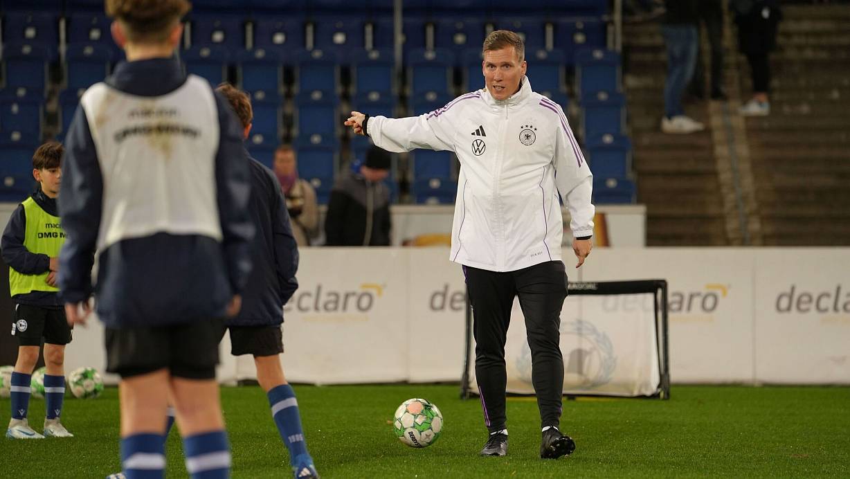 DFB-Trainer Hannes Wolf erklärt in der Schüco-Arena den jungen Arminen eine Übung. | © DSC Arminia