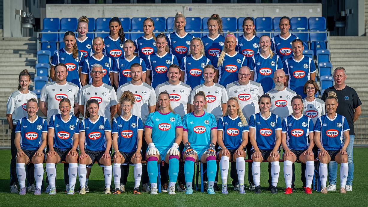 Gut aufgestellt: Arminias Regionalligafrauen Saison 2025/26: Clara Bockrath Esparza (o.v.l), Inci Fenu, Sophia Pauli, Susi Werner, Sophia Thiemann, Lea Bultmann und Leonie Heidlindemann. Phine Ebert (3.Reihe v.l,) Paula Peters, Martha Stuckenschnieder, Thandie Reinkensmeier, Maren Allmeroth, Emelie Klingen, Marie Bärenwaldt und Lisa Lösch. Trainerin Annabel Jäger (2. Reihe v.l.), Co-Trainer Kevin Stwolinski, Torwarttrainer Volker Drobe, Athletik Trainer Lukas Bachus, Reha Trainer Philipp Prill, Physiotherapeutin Michelle Osmers, Betreuer Tobias Lison, Betreuer Wolfgang Biermann, Betreuerin Simone Biermann und der Sportliche Leiter Torsten Schäfer. Fabienne Brakemeier (v.v.l.), Rieke Barkhausen, Anna Czekalla, Hannah Wehmeyer, Kira Kutzinski, Lisa Venrath, Celine Preuss, Jana Leuchtmann, Lena Strothmann und Jocelyn Hampel. | © Thomas F. Starke