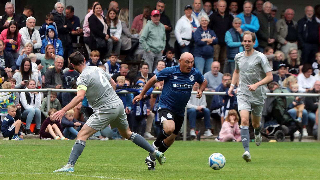 Arminias Traditionsmannschaft, hier Fatmir Vata in der Mitte, spielte mit vollem Einsatz beim VfL Ummeln | © Wolfgang Rudolf