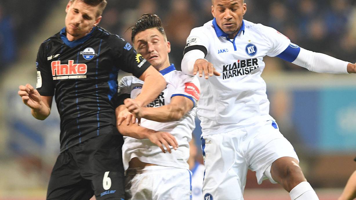 Doch auch das Badener Bollwerk konnte die Angriffswellen des Spitzenreiters nicht gänzlich stoppen. So war der SCP zwar nicht das zwingend bessere, aber definitiv das gefährlichere Team. Vor allem in den letzten Minuten vor der Pause gaben die Hausherren Gas. In der 39. Minute führte ein abgeblockter Schuss von Sven Michel fast zum Karlsruher Eigentor. Es folgte die erste Paderborner Ecke, nach der Ben Zolinski mit einem Seitfallzieher an KSC-Keeper Benjamin Uphoff scheiterte. Dann lenkte Karlsruhes Innenverteidiger David Pisot einen Abschluss von Marlon Ritter ans Lattenkreuz. Und nach einer scharfen flachen Hereingabe von Antwi-Adjei stolperte Pisots Teamkollege Florent Muslija den Ball mit mehr Glück als Verstand über die Torlatte.