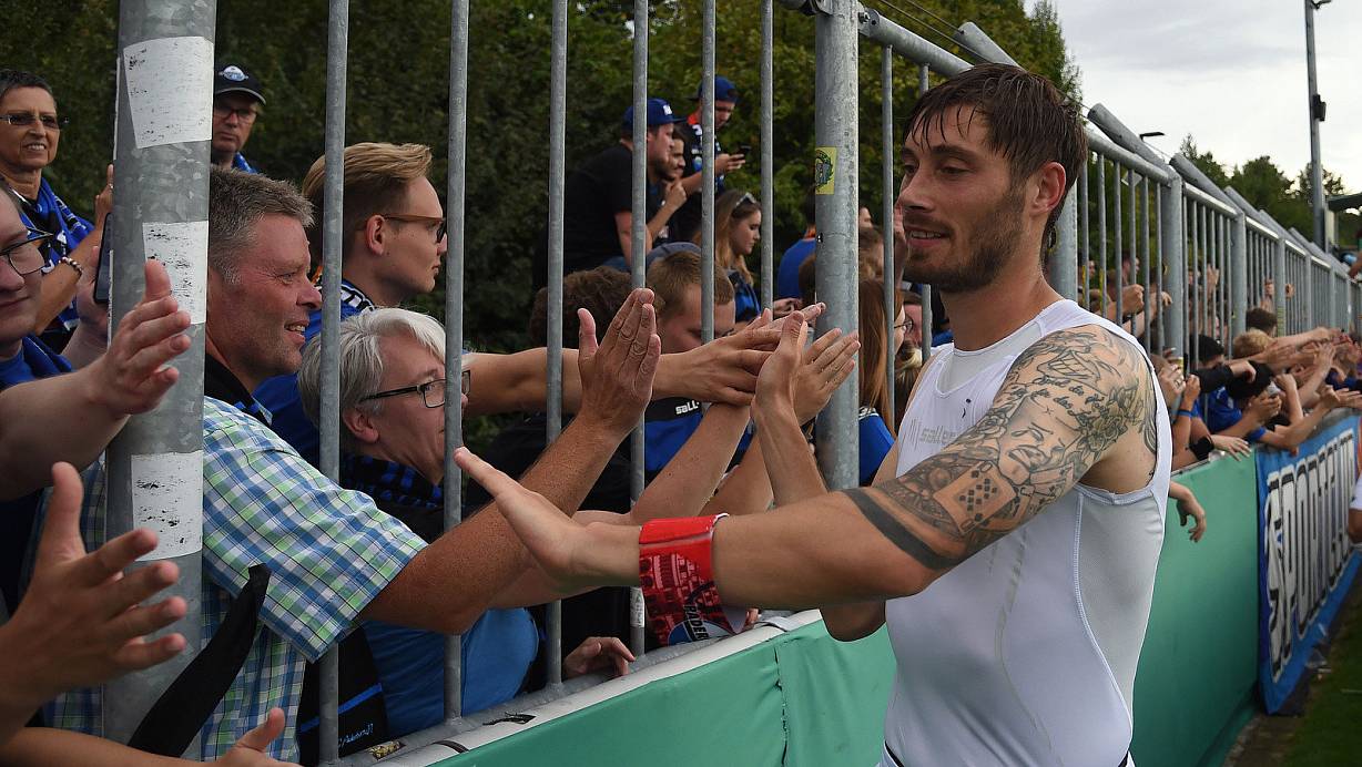 Identifikationsfigur: Kapitän Christian Strohdiek bedankt sich nach dem DFB-Pokal-Zittersieg in Rödinghausen bei den mitgereisten Fans. | © Ulrich Petzold