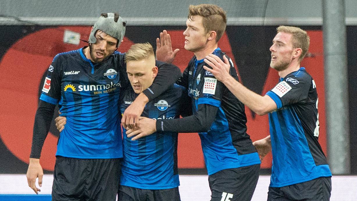 Die Paderborner (v. l.) Klaus Gjasula, Torschütze Kai Pröger, Luca Kilian und Laurent Jans jubeln über den 1:1-Treffer gegen Union Berlin. | © picture alliance