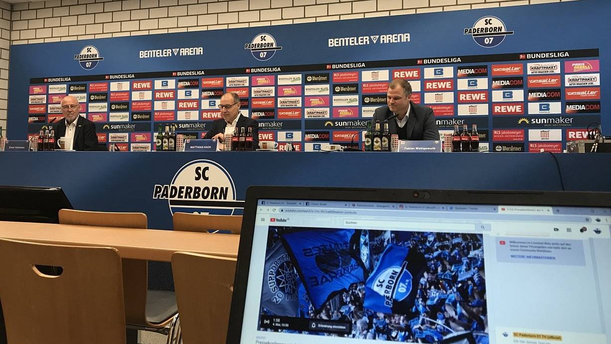 Fabian Wohlgemuth (r.) steht bei der virtuellen Pressekonferenz in der Benteler-Arena Rede und Antwort. Mit dabei sind Vereinschef Elmar Volkmann (l.) und Pressesprecher Matthias Hack. | © Kim Liebeck/SC Paderborn