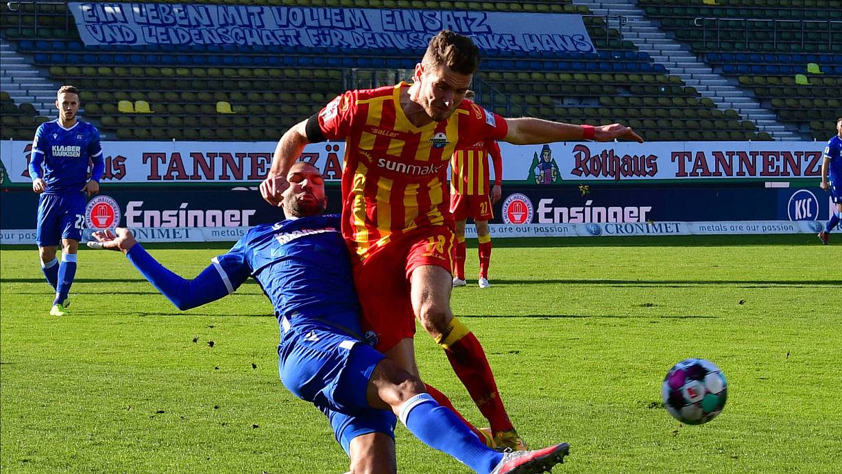 Während SCP-Stürmer Dennis Srbeny (r.) einen gebrauchten Tag erwischte, war Daniel Gordon (l.) als Torschütze der Held des Tages. Auch in diesem Duell behält der Karlsruher Abwehr-Routinier die Oberhand. | © imago images/Jan Huebner