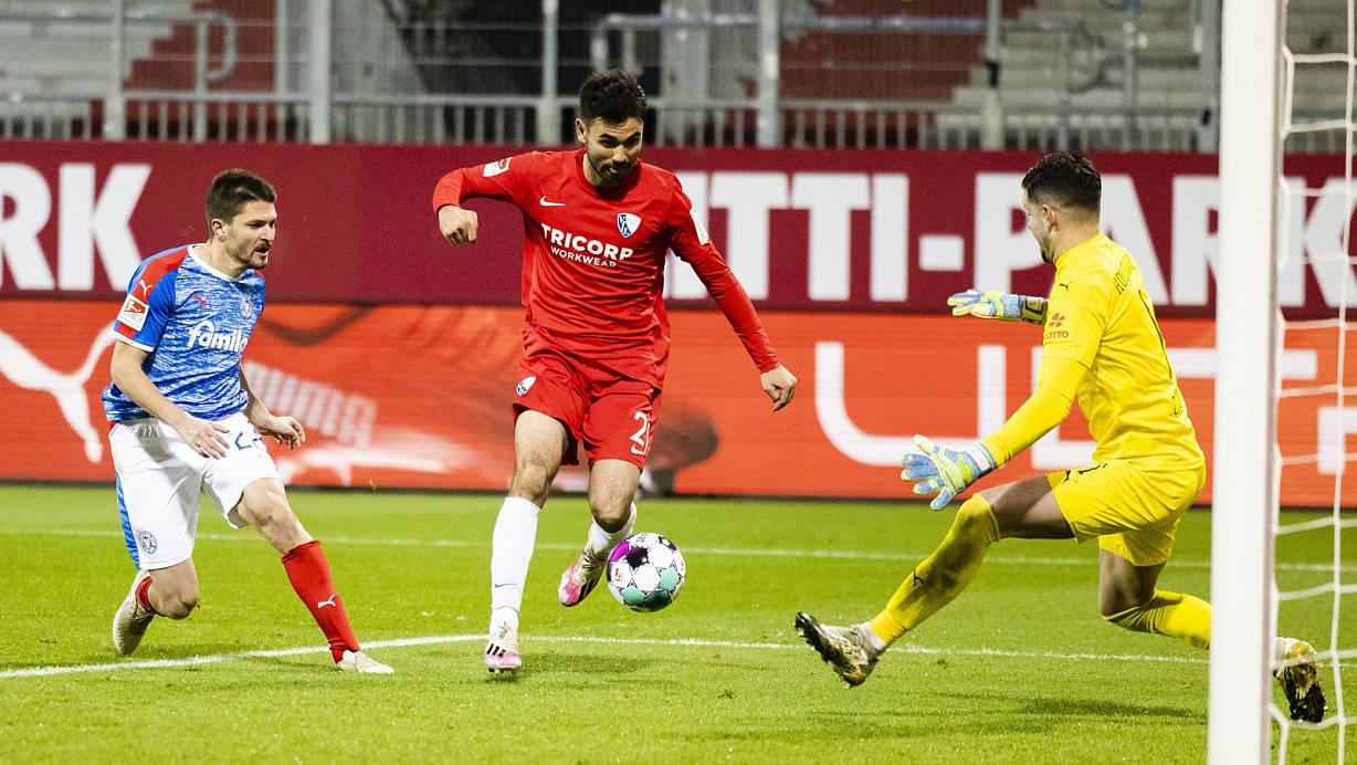 In dieser Szene hätte Gerrit Holtmann (M.) sein erstes Tor für den VfL Bochum machen können, doch der Ex-Paderborner scheitert am Kieler Torwart Ioannis Gelios. Dessen Teamkollege Aleksandar Ignjovski (l.) schaut gebannt zu. | © picture alliance/dpa
