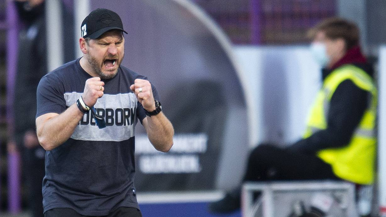 SCP-Trainer Steffen Baumgart ballt nach dem Schlusspfiff in Osnabrück die Siegerfäuste. Nach zuvor vier sieglosen Spielen in Folge hatte seine Mannschaft den ersehnten Erfolg eingefahren. | © Noah Wedel