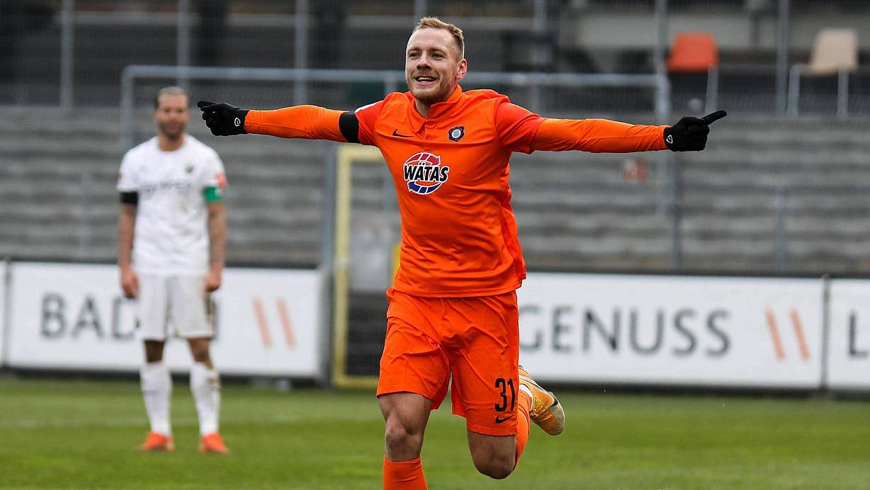 Beim 4:1-Sieg in Sandhausen erzielte Ben Zolinski seine ersten Tore für Aue. Hier jubelt der Ex-Paderborner über seinen Treffer zum 3:1. | © imago images/Jan Huebner