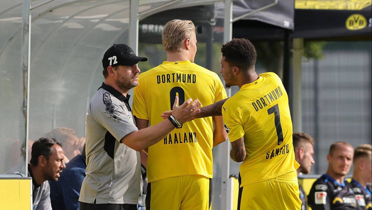 SCP-Coach Steffen Baumgart (l.) freut sich auf das Wiedersehen mit Weltklasse-Spielern wie Jadon Sancho (r.) und Erling Haaland. | © picture alliance