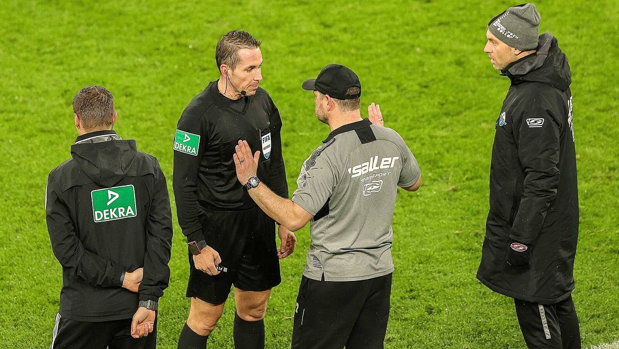 Schiedsrichter Tobias Stieler und SCP-Coach Steffen Baumgart diskutieren über die Entscheidung, den Dortmunder 3:2-Treffer anzuerkennen. Co-Trainer Daniel Scherning (r.) und der vierte Offizielle Thorben Siewer (l.) werden Zeugen des Dialogs. | © picture alliance