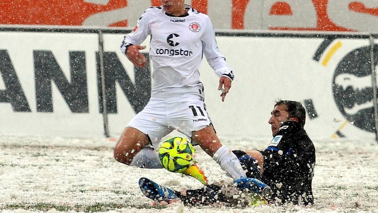 Am 24. Januar 2015 gab's in der Paderborner Arena in winterliches Testspiel gegen St. Pauli. Hier fährt der unvergessene SCP-Verteidiger Rafa Lopez dem Paulianer Marc Rzatkowski in die Parade. | © picture alliance