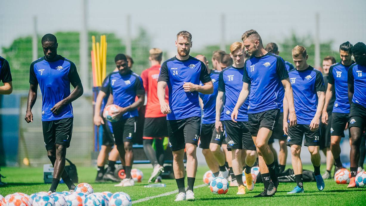 Auch die SCP-Akteure (vorne v. l.) Prince Owusu, Jannis Heuer und Dennis Srbeny müssen sich bis Samstag gedulden, ehe das erste Testspiel ansteht. Die am Freitag geplante Partie gegen Duisburg fällt aus. | © Besim Mazhiqi