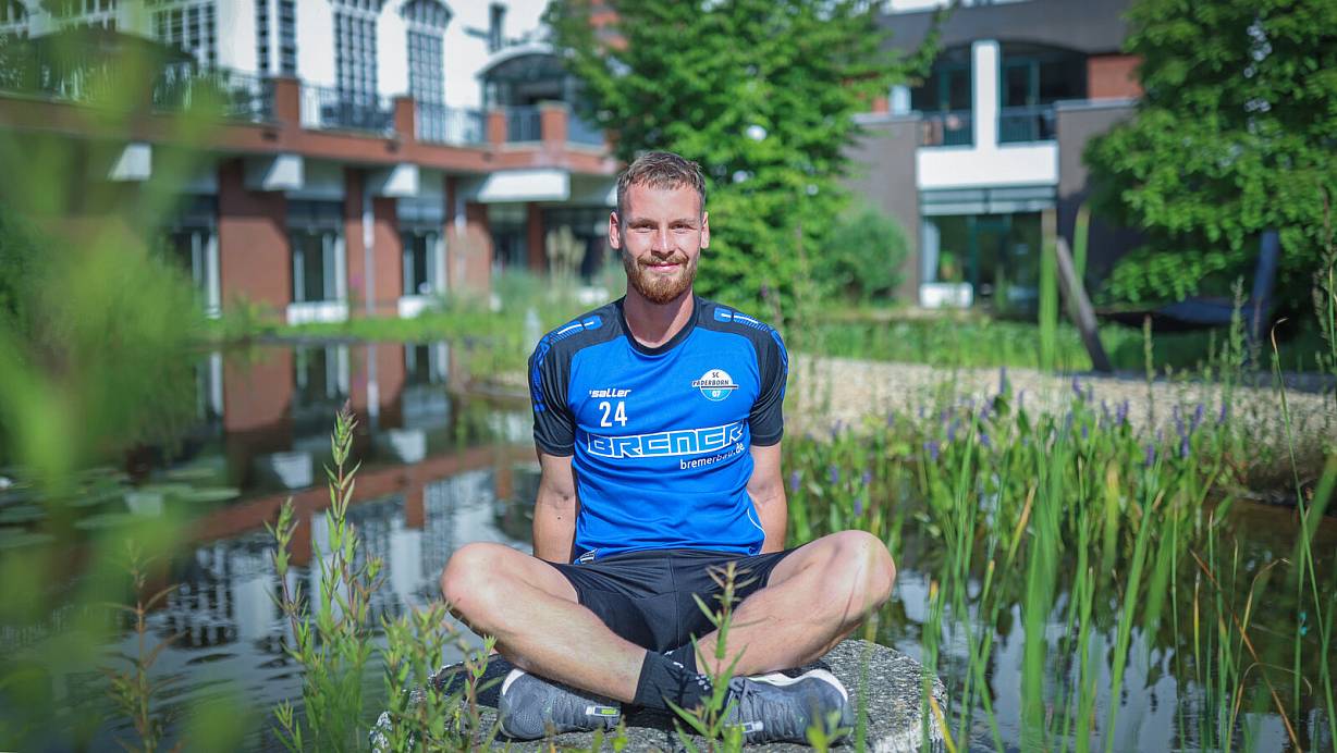 SCP-Neuzugang Jannis Heuer gönnt sich am Teich vor dem Teamhotel in Garderen eine kleine Verschnaufpause. | © Sarah Jonek Fotografie
