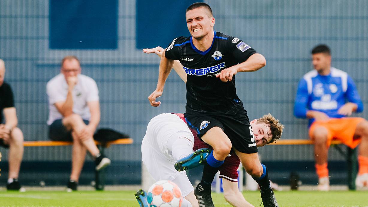 SCP-Neuzugang Marcel Mehlem, der hier im Testspiel gegen den SC Verl unsanft gestoppt wird, kann austeilen, aber auch einstecken. | © Besim Mazhiqi