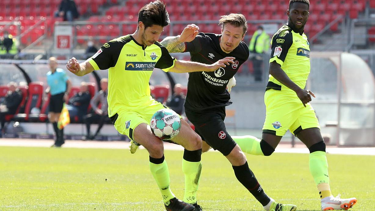 SCP-Innenverteidiger Marcel Correia (l.), hier in der vergangenen Saison im Duell gegen den Nürnberger Stürmer Manuel Schäffler, steht in Dresden erstmals in dieser Spielzeit im Paderborner 20er-Kader. | © picture alliance