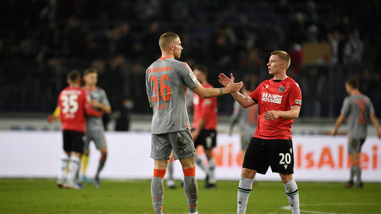 Hannovers Philipp Ochs (r.) und Paderborns Felix Platte klatschen nach dem Spiel ab. Es war ein am Ende gerechtes Unentschieden. | © picture alliance/dpa