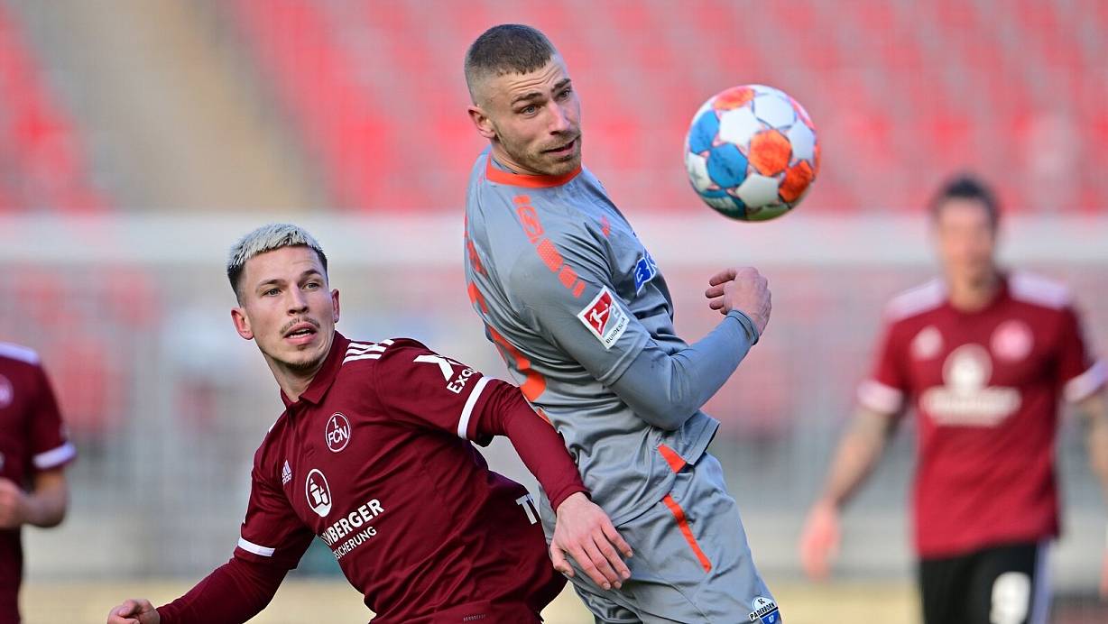 Stürmer Felix Platte (r.), hier gegen Nürnbergs Lino Tempelmann, erzielte mit seinem achten Saisontreffer das 2:0 für Paderborn. | © picture alliance / Sportfoto Zink / Wolfgang Zink