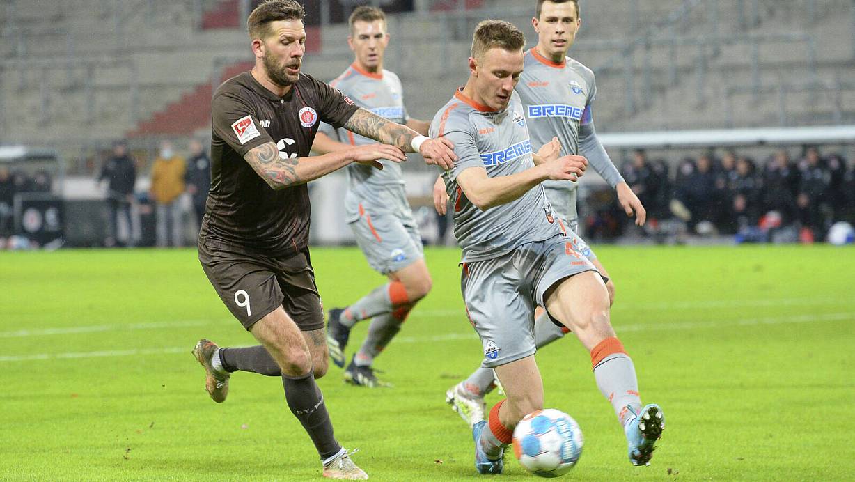 Beim 2:2 auf St. Pauli verlor SCP-Innenverteidiger Jasper van der Werff (r.), hier gegen Pauli-Torjäger Guido Burgstaller, keinen einzigen Zweikampf. | © imago images/Beautiful Sports