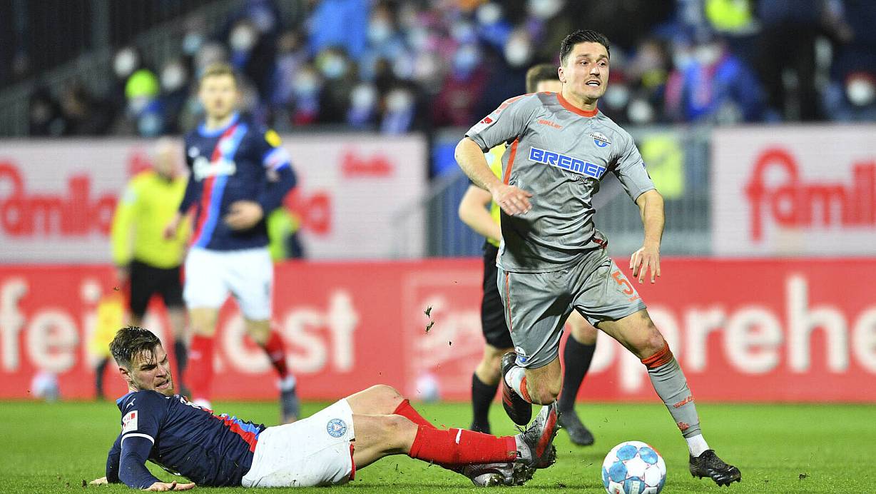 Marcel Mehlem (r.), der sich hier gegen den Kieler Simon Lorenz durchsetzt, feierte beim Paderborner 4:3-Sieg an der Ostsee ein gelungenes Comeback. | © IMAGO/Beautiful Sports