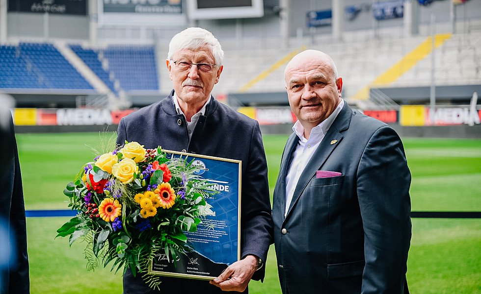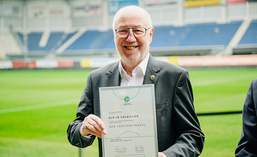 „Finke und ich, wir waren unterschiedlich, aber im Ergebnis immer vereint. Es war immer Teamarbeit und ich bin immer ein Teamplayer gewesen, der alle miteinbinden wollte“, sagte Elmar Volkmann sichtlich stolz über diese besondere Auszeichnung. Zuvor bekam er noch die Goldene Verdienstnadel des DFB verliehen.