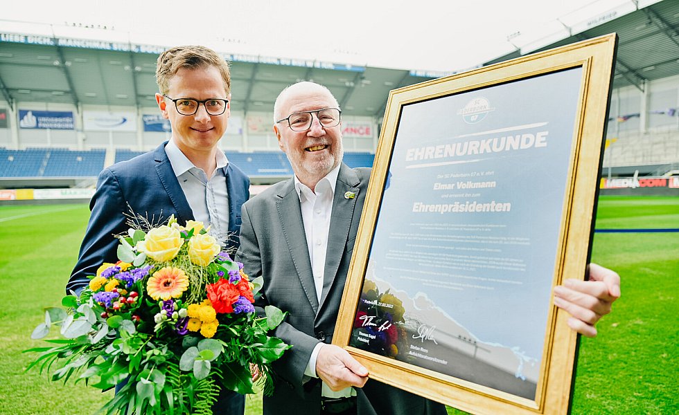 Paderborn. Die Benteler-Arena war der ideale Ort, um Personen, die sich besonders für den SC Paderborn engagieren, gebührend zu ehren. Doch bei der Versammlung am Sonntagmorgen waren nur 156 Mitglieder des SCP dabei. Elmar Volkmann, jahrzehntelanger Aufsichtsratsvorsitzender und zuletzt noch Präsident, hätte eine größere Kulisse verdient gehabt als er zum Ehrenpräsidenten des SC Paderborn ernannt wurde.