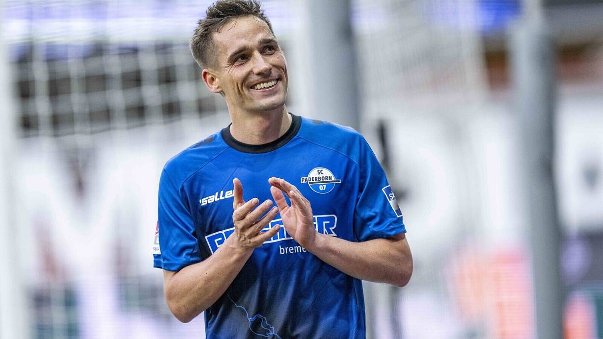 Philipp Klement bedankt sich bei seiner Auswechslung bei den Paderborner Fans, die ihn lautstark feiern. | © picture alliance/dpa