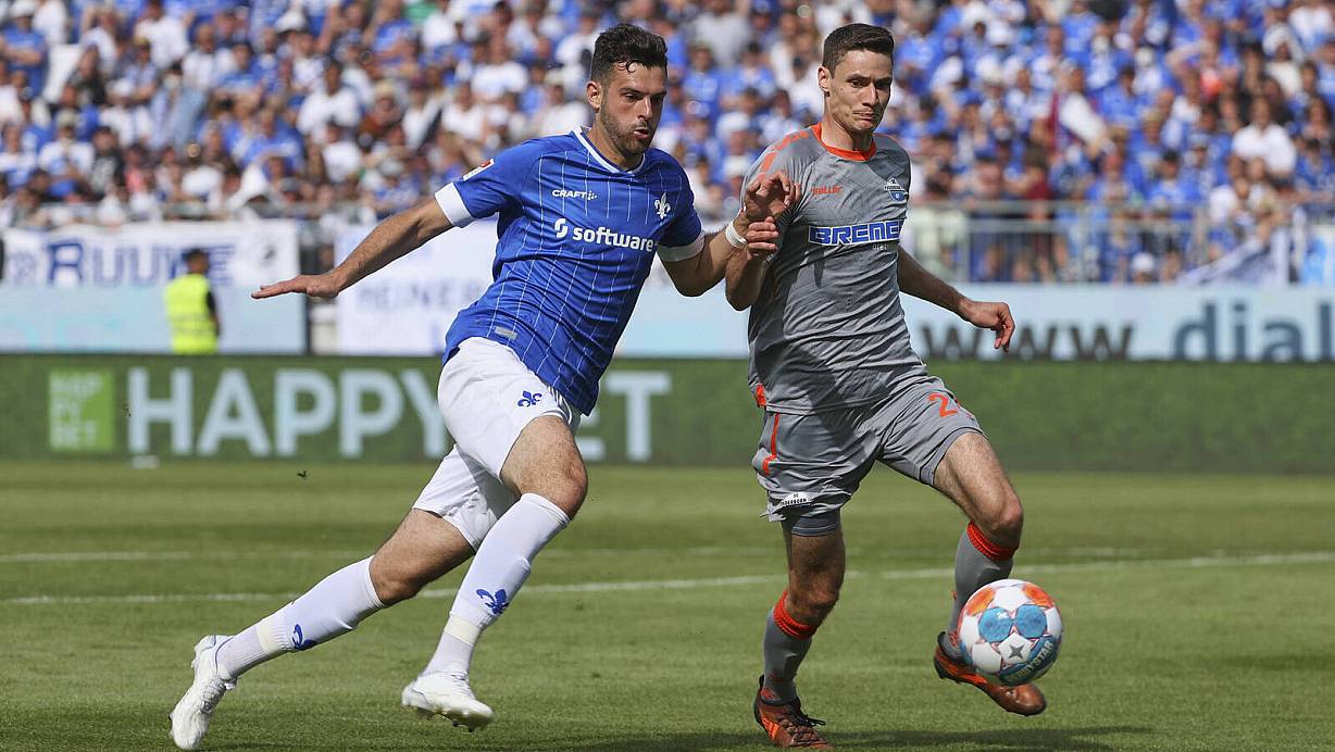 Darmstadts Torjäger Luca Pfeiffer (l.), hier gegen Maxi Thalhammer, schenkte seinem Ex-Klub Paderborn zwei Tore ein. | © Imago Images