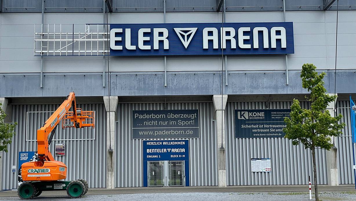 Per Hubwagen werden derzeit die "Benteler-Arena"-Schilder am Paderborner Stadion abmontiert. In rund vier Wochen werden dann die "Home Deluxe-Arena"-Schilder installiert. | © Ralph Meyer