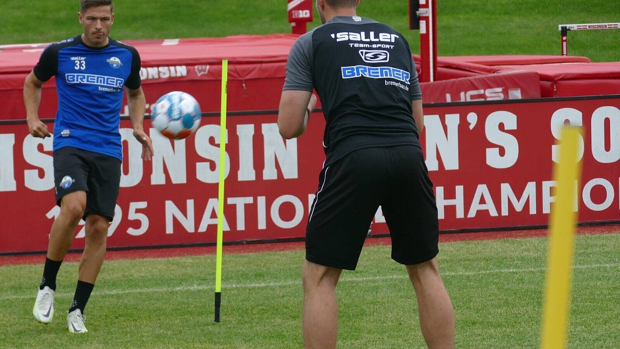 SC Paderborn-Neuzugang Marcel Hoffmeister (l.) trainierte am Montag individuell mit Athletik-Trainer Nils Vogt. | © Benedikt Riemer