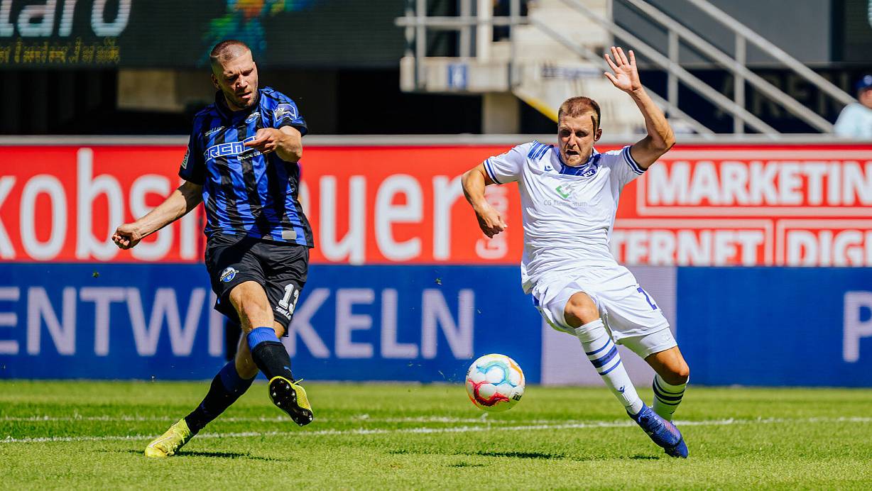 Robert Leipertz (l.), der hier gegen KSC-Akteur Marco Thiede zum Abschluss kommt, dürfte am Freitag im Gastspiel beim 1. FC Kaiserslautern einsatzbereit sein. | © Besim Mazhiqi