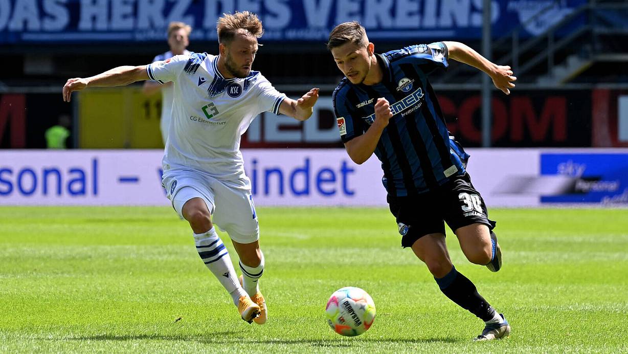 Florent Muslija (r.), der sich hier gegen den Karlsruher Lucas Cueto durchsetzt, stand bislang in allen sieben Zweitliga-Saisonspielen in der Paderborner Startelf. | © Imago Images