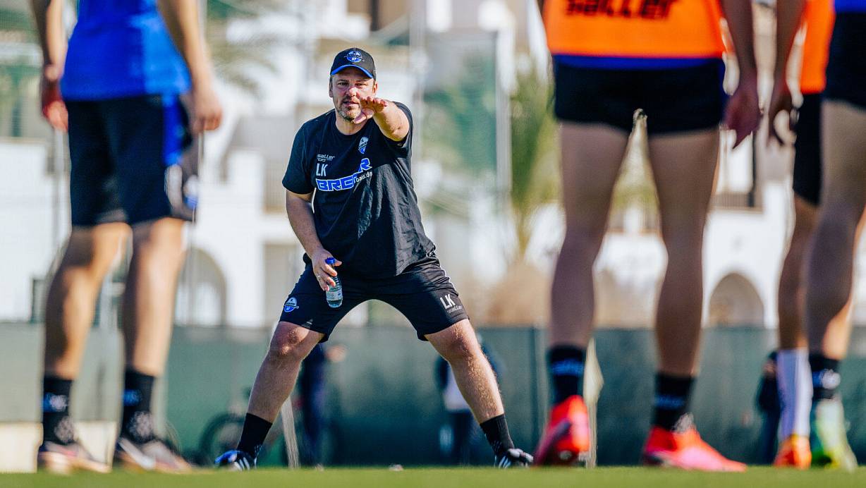 SCP-Cheftrainer Lukas Kwasniok gibt seinen Schützlingen auf dem Trainingsplatz im spanischen Roldán taktische Anweisungen. | © Besim Mazhiqi