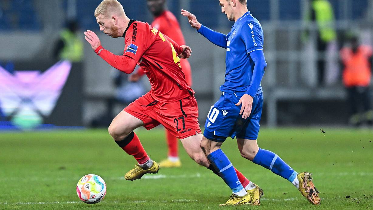 SCP-Mittelfeldakteur Kai Klefisch (l.), der sich hier gegen KSC-Akteur Marvin Wanitzek durchsetzt, bestritt am Freitag sein erstes Zweitligaspiel. | © picture alliance