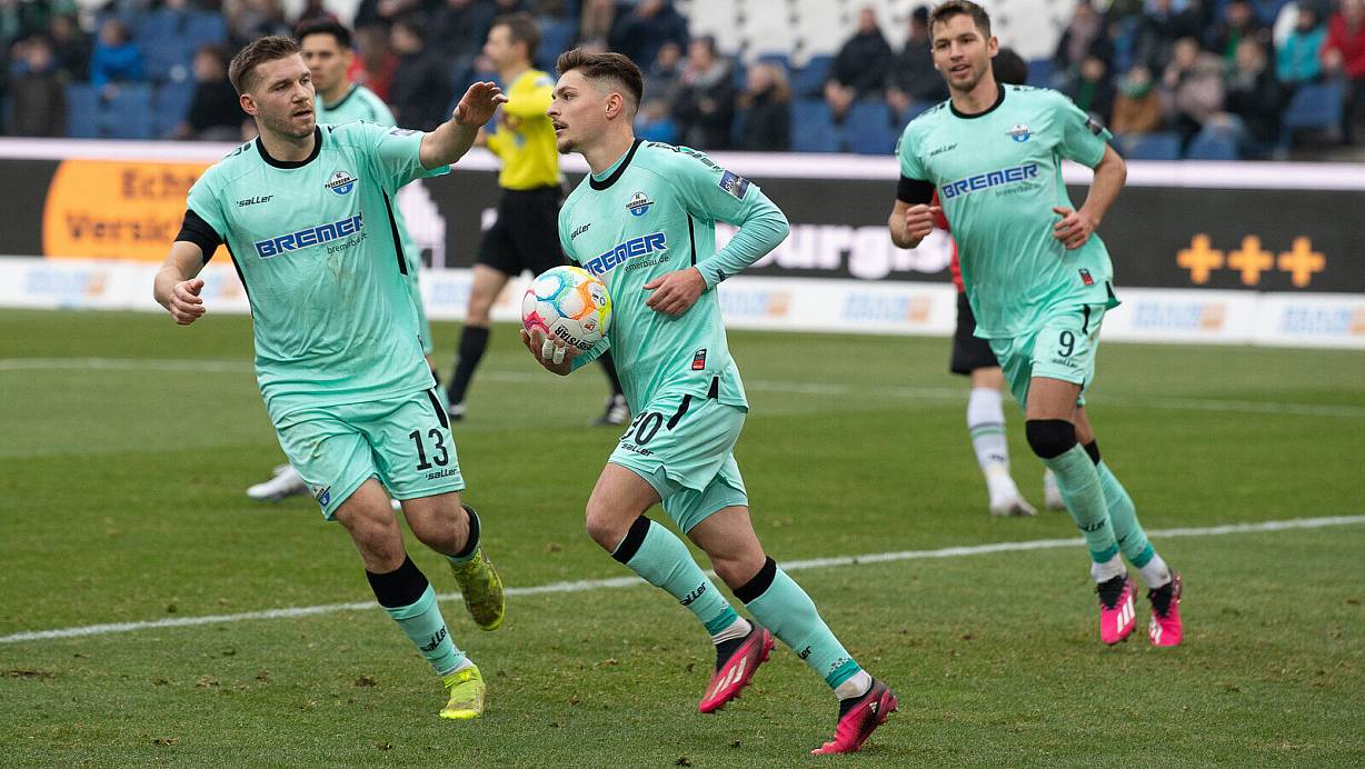 Florent Muslija (M.) hat soeben per Elfmeter das 2:2 erzielt. Doppeltorschütze Robert Leipertz gratuliert. Hinten rechts ist Marvin Pieringer zu sehen, der das 2:4 vorbereitete und ebenfalls eine gute Leistung bot. | © picture alliance/dpa