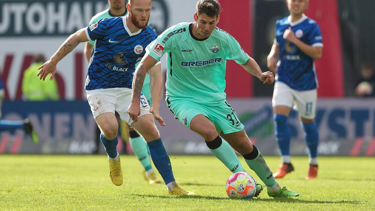 SCP-Akteur Maximilian Rohr (r.), hier im Hinspiel gegen Rostocks Nils Fröling, rückt wohl in die Abwehrkette. | © picture alliance / Eibner-Pressefoto