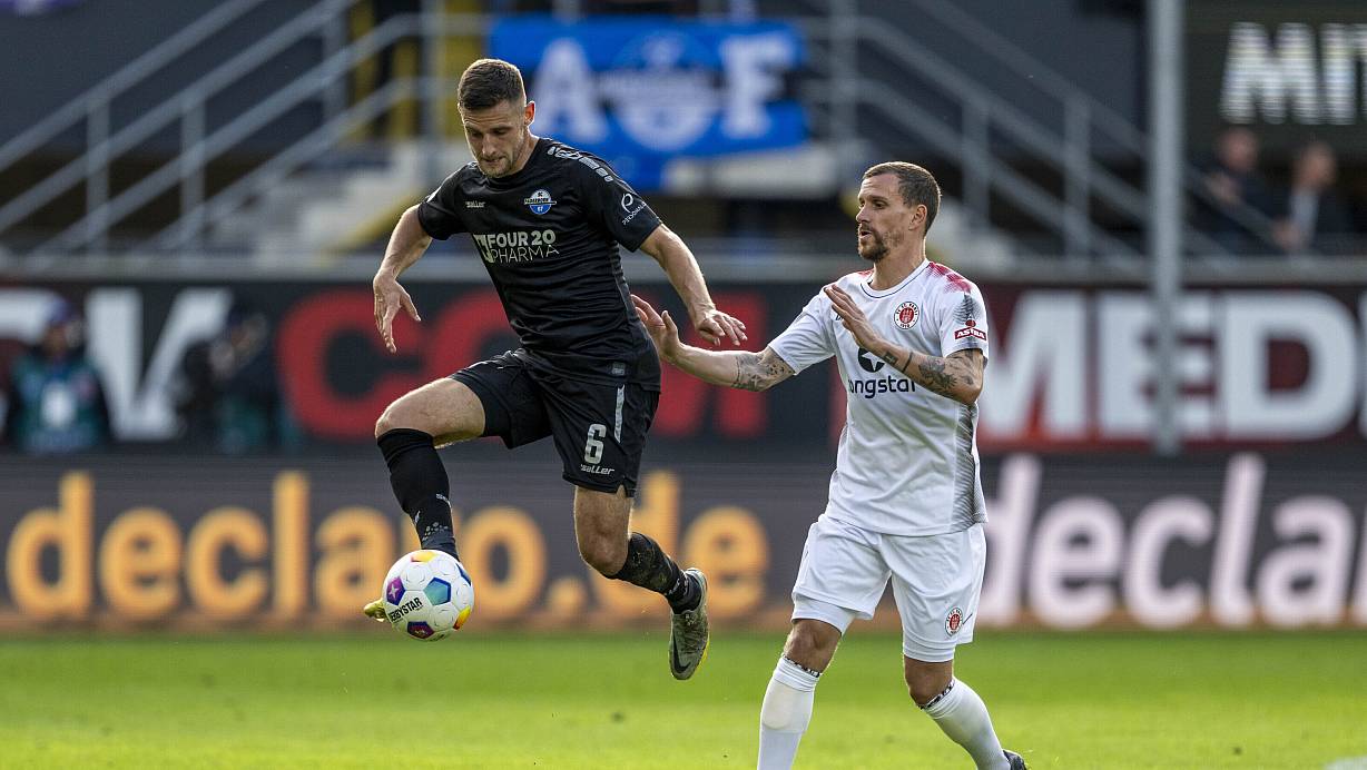 Marco Schuster, der in dieser Szene gegen St. Paulis Stürmer Simon Zoller den Ball behauptet, hofft gegen Rostock auf seinen achten Startelf-Einsatz der Saison. | © picture alliance/dpa